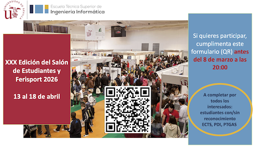 La Escuela participará con un stand informativo en el XXX Salón de Estudiantes de Grado y Posgrado 2026 de nuestra Universidad, que se celebrará del 13 al 18 de abril en el Complejo Deportivo Universitario SADUS (Los Bermejales). Este evento anual reúne a miles de estudiantes interesados en conocer la oferta académica, los servicios universitarios y las oportunidades formativas disponibles. Nuestro stand ofrecerá información personalizada sobre titulaciones, orientación académica y experiencias del estudiantado, contribuyendo a acercar la realidad de la Escuela a futuros estudiantes. Además, se enmarca en un programa que incluye charlas, talleres y actividades diseñadas para facilitar la toma de decisiones sobre el futuro universitario. ¡Anímate a visitarlo!