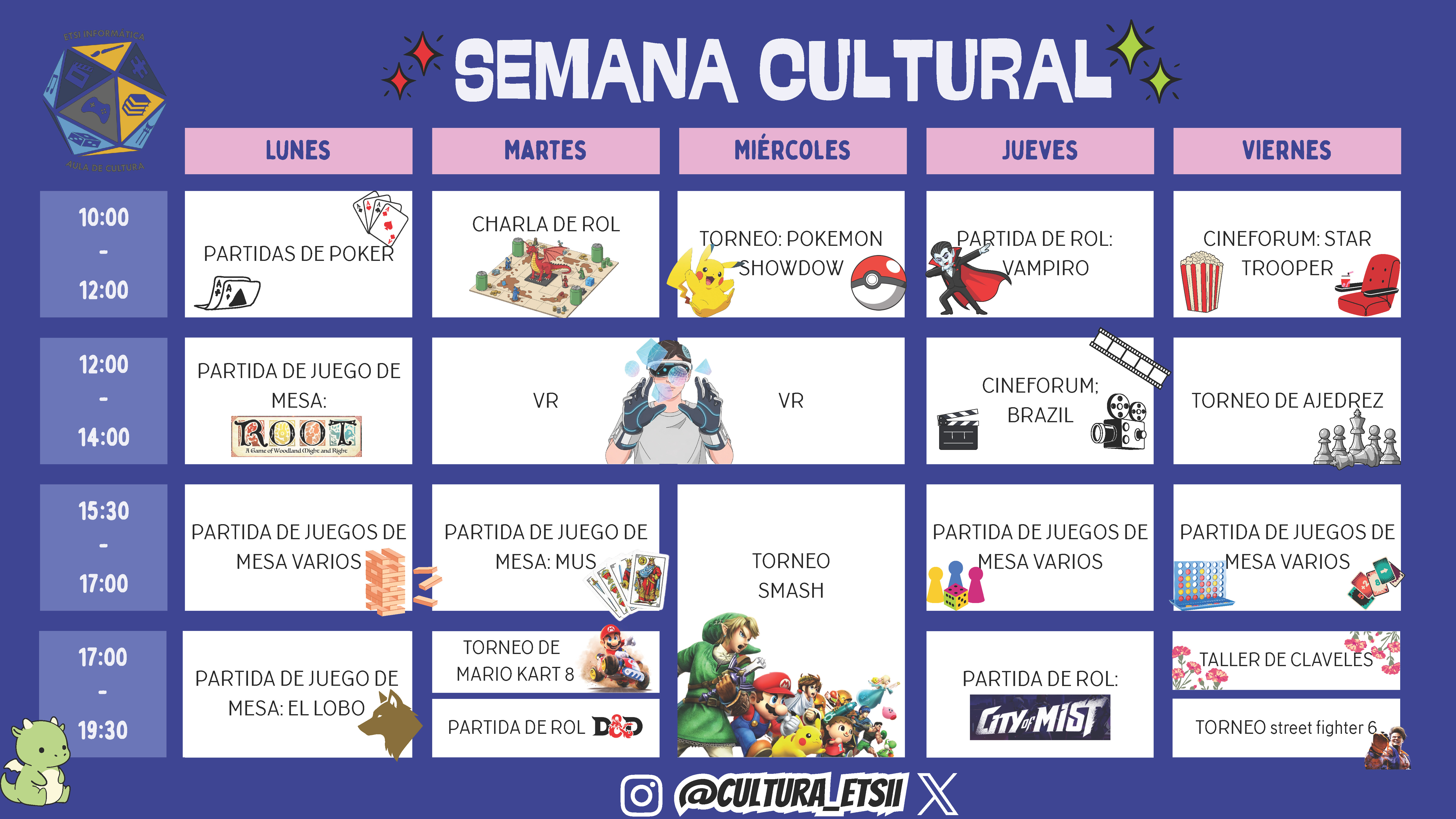 Se acerca una semana repleta de creatividad, retos y mucha emoción. El Aula de Cultura y Medioambiente de nuestra Escuela anuncia la Semana de la Informática y la Cultura 2026, con distintas actividades pensadas para aprender, divertirse y conocer a otras personas interesadas en el mundo del entretenimiento. Del 9 al 13 de febrero, toda la comunidad de estudiantes está invitada a formar parte de esta experiencia. Consulta el horario en las pantallas de la Escuela, en la agenda y en el tablón de la dinamizadora de centro situado en el vestíbulo principal o pásate por el Aula de Cultura en la zona del sótano. ¡Participa y disfruta!