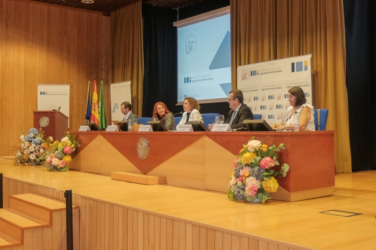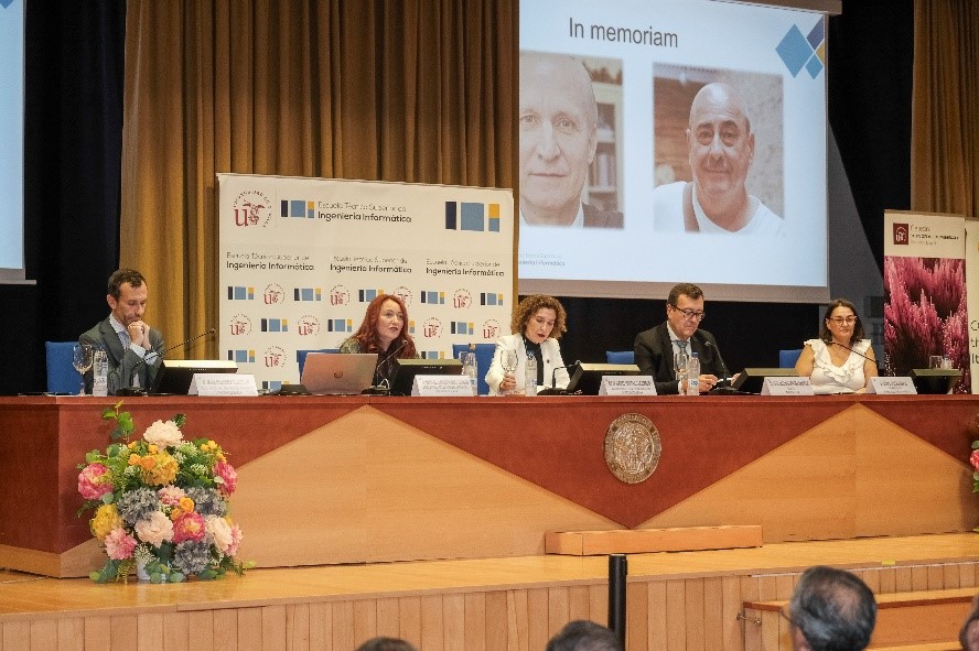 El acto fue inaugurado por la Vicerrectora de Transformación Digital, Dña. Mª Isabel Hartillo Hermoso, quien dio la bienvenida a los asistentes y presentó a los miembros de la mesa institucional: Dña. María del Carmen Romero Ternero, Directora de la ETSII; D. Juan Antonio Ortega, Gerente de FIDETIA; D. Jaime Benjumea, Secretario de la ETSII; y la profesora Coral Calero Muñoz, Catedrática de la Universidad de Castilla-La Mancha.
