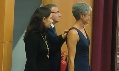 Tras su charla, la ceremonia ha continuado con la imposición de la medalla que distingue a los miembros numerarios de la academia y D.ª Rocío González ha jurado su compromiso institucional. Finalmente, ha sido recibida por los restantes Académicos como nuevo miembro, recibiendo los simbólicos abrazos de cada uno, y ha sido invitada a ocupar su asiento entre ellos.